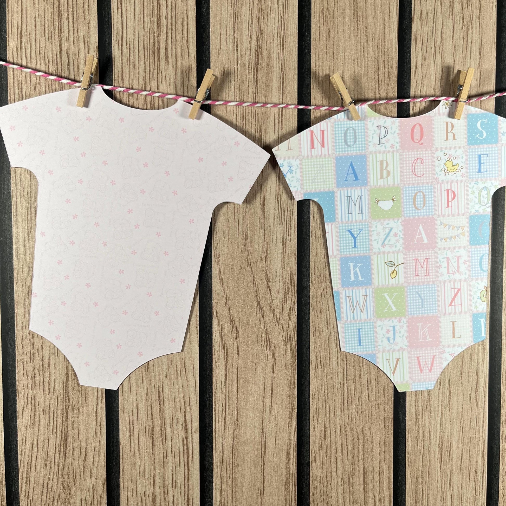 Add a charming touch to your baby shower, christening, or to welcome a newborn home with this cute baby vest bunting. Each vest is individually cut from card and attached to a washing-line style string with tiny wooden pegs, creating a whimsical and handmade look.